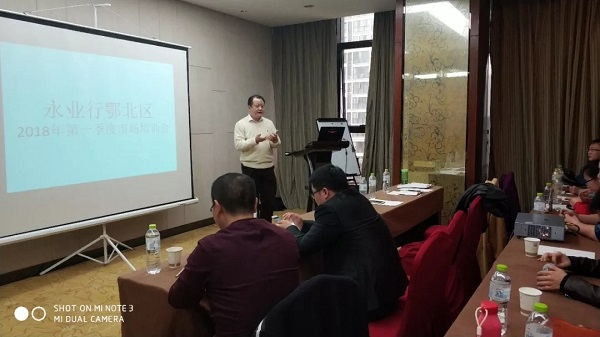 3月23日,永业行鄂北区举办2018年一季度市场培训会,副总裁刘晓峰、十堰区域总监周小川、襄阳区域总监江水、随州分公司负责人王辉及十堰、襄阳、随州区域市场人员参加了培训。
