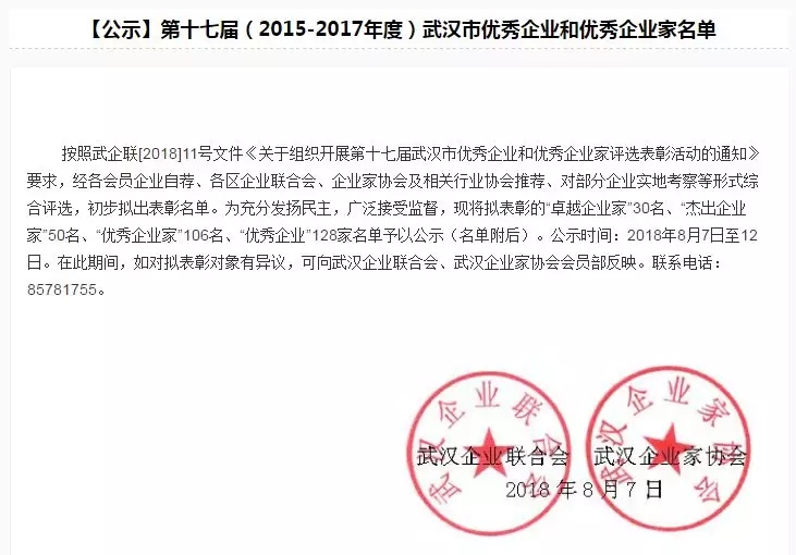 “武汉市优秀企业”和“武汉市优秀企业家”评选表彰,是由武汉企业联合会、武汉企业家协会从1984年起,为促进企业创新发展、弘扬企业家精神、推动我市企业家队伍建设而组织开展的表彰活动。