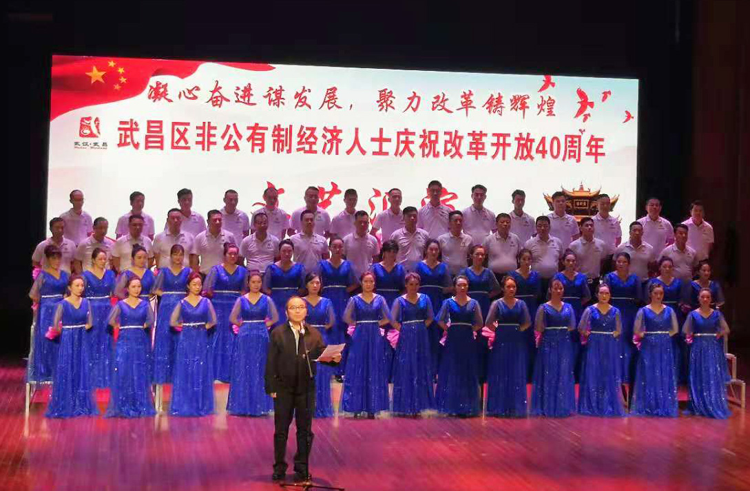 2018年11月4日下午,武汉音乐学院黄钟厅灯光绚丽,宾朋满座。武汉市武昌区非公有制经济人士庆祝改革开放40周年文艺汇演在此拉开序幕。来自武昌地区数十家民营企业、商协会的精英们齐聚江边,以歌舞、合唱、朗诵等节目形式,热情歌颂改革开放 40 周年,为在场的 500 余名观众带来了一场视听盛宴。永业行合唱团登台合唱《共和国之恋》,以饱满的精神状态展示出永业行人的活力与能量,赢得满场喝彩,获得本次文艺汇演的“组织奖”。
