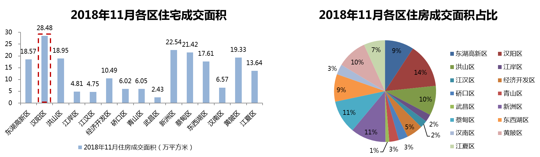 2018年11月,住宅市场共成交201.66万平方米,其中汉阳区成交量最高,成交面积为28.48万平方米,占2018年11月住宅成交面积的14%。主城区住宅成交量为100.56万平方米,占总成交面积的49.86%;远城区住宅成交量为101.10万平方米,占总成交面积的50.14%。