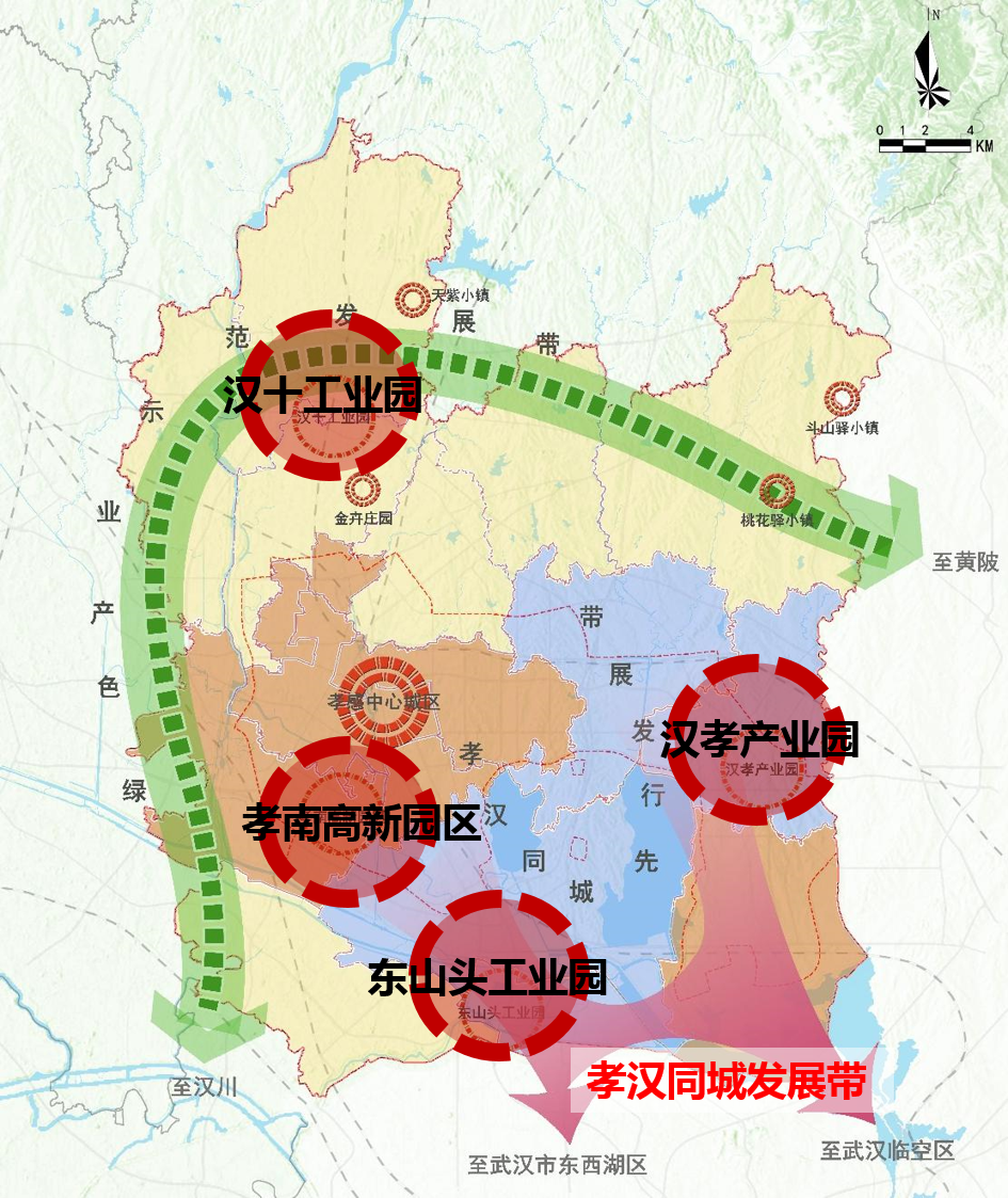 《方案》以“综合开发,高效利用”为目的,通过对存量空间的“填充式开发”,推动“产-城-人”协调发展。以区域协同、品质提升和产业发展为切入点,提出区域融合发展型、城镇品质提升型、产业升级发展型三条功能主线。在此基础上形成“2+3+6”的十一个成片开发片区有效地保障了孝南区建设项目落地,为孝南“南城突起、两带支撑、孝汉融合、多点发力”的发展战略实施提供了有力的支撑。
