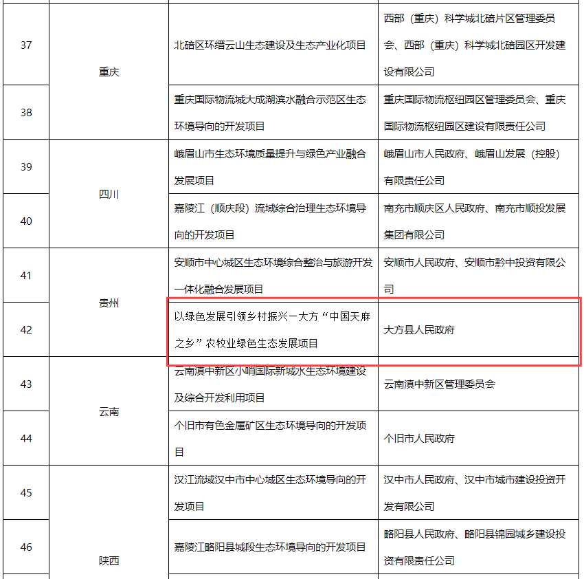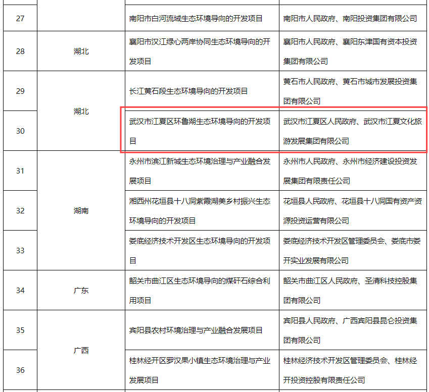 永业行承担的贵州省以绿色发展引领乡村振兴—大方“中国天麻之乡”农牧业绿色生态发展项目、湖北省武汉市江夏区环鲁湖生态环境导向的开发项目入选,目前正在推动多元化筹融资以及引入社会资本合作实施落地。受大方县人民政府和武汉市江夏区人民政府委托,永业行提供了包括投融资策划、EOD试点申报等咨询服务。