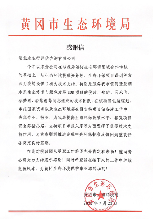 7月22日,黄冈市生态环境局致函永业行,对我司在生态环境投融资策划、生态环保项目谋划工作给予肯定和感谢。