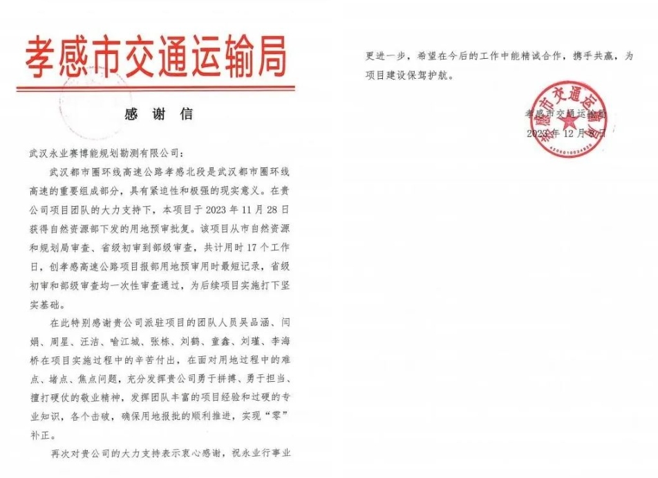 感谢信称,在武汉都市圈环线高速公路孝感北段用地预审工作中,我公司充分发挥了勇于拼搏、勇于担当、擅打硬仗的敬业精神,凭借团队丰富的项目经验和过硬的专业知识,该项目从市自然资源和规划局审查、省级初审到部级审查,共计用时17个工作日,创造了孝感市高速公路项目报部用地预审用时最短记录,省级初审和部级审查均一次性审查通过,实现了“零”补正,为后续项目实施打下坚实基础。感谢信对项目组成员(吴品涵、闫娟、周星、汪洁、喻江城、张栋、刘鹤、童鑫、刘瑾、李海桥)在项目实施过程中的辛苦付出给予了充分肯定。