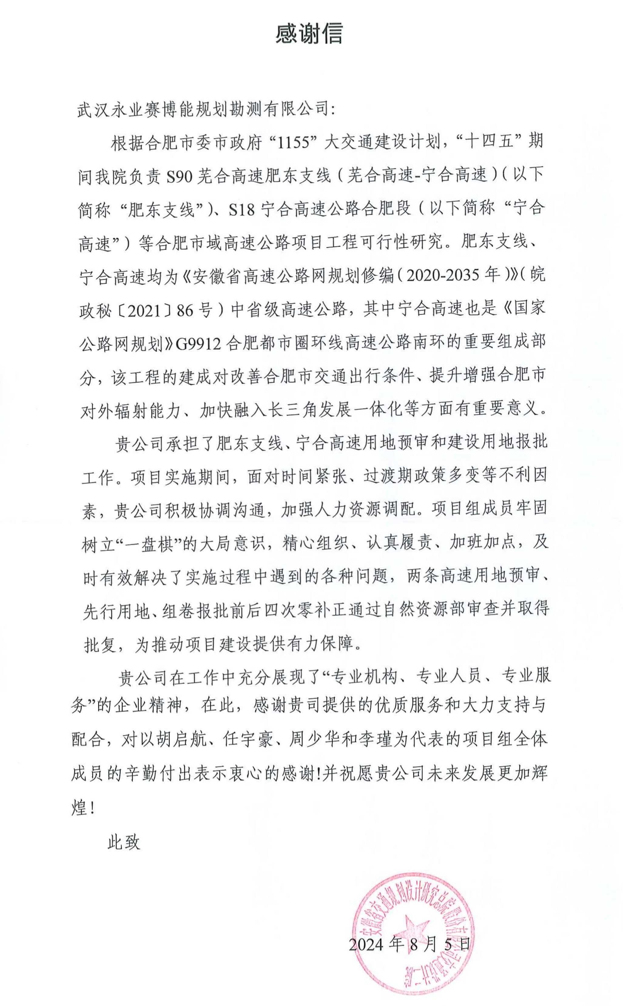 感谢信称,S18宁合高速公路合肥段、S90芜合高速肥东支线(芜合高速-宁合高速)均为省级高速公路。自永业行承接项目用地预审和建设用地报批工作以来,面对时间紧张、任务重、过渡期政策多变的挑战,项目组成员(胡启航、任宇豪、周少华、李瑾等)展现了高度的专业精神和职业素养,通过对新政策、新规则的精准把控,合理分解任务,有效解决问题,实现了两条高速公路用地预审、先行用地、组卷报批零补正通过自然资源部审查,获得业主好评。