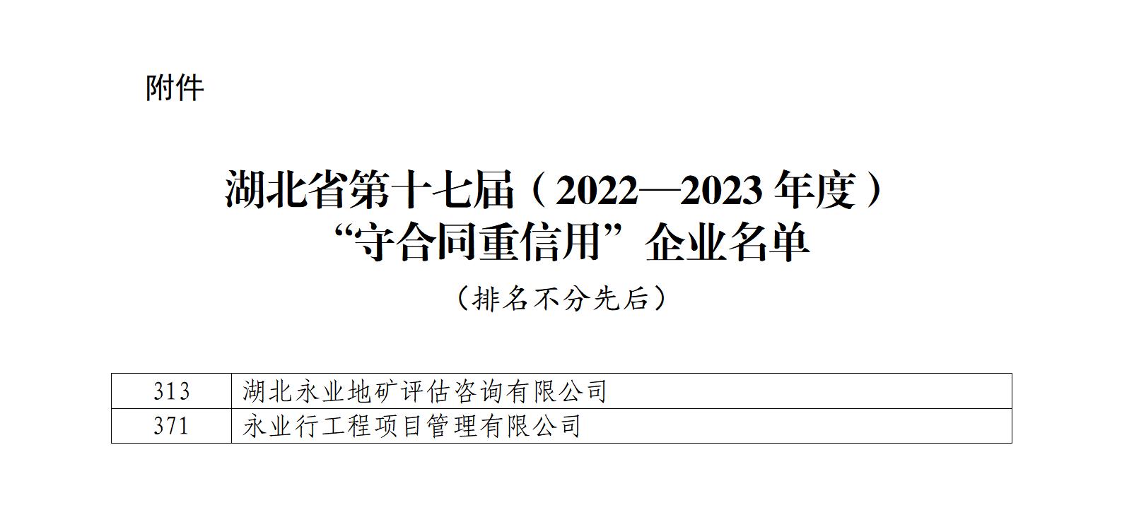 2024年10月21日,湖北省市场监督管理局公布了湖北省第十七届 (2022—2023年度)“守合同重信用”企业名单。成员机构湖北永业地矿评估咨询有限公司、永业行工程项目管理有限公司榜上有名,连续十三年获评湖北省“守合同重信用企业”。